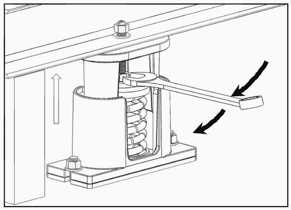使用開口扳手以順時(shí)針方向調(diào)整螺母使彈簧受力下壓,調(diào)整至臨時(shí)木臺(tái)可取出時(shí)停止調(diào)整。(如圖5)