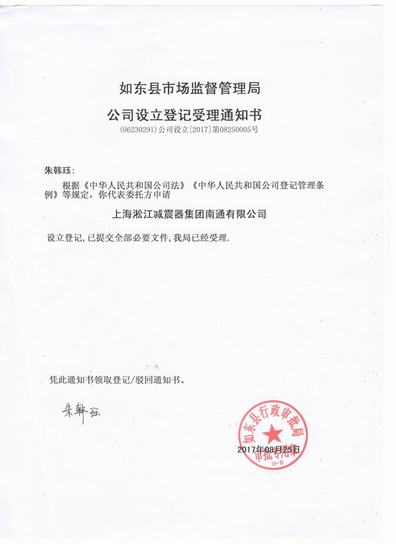 以上上海淞江減震器集團南通有限公司準予設立登記通知書信息來源于上海淞江減震器集團有限公司官方網(wǎng)站文章中心。