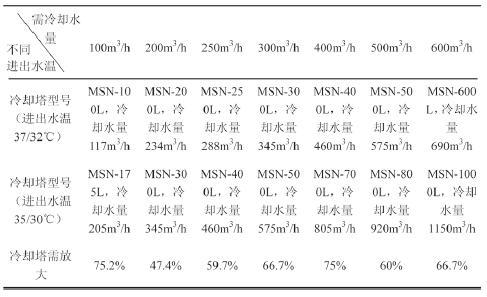 (2)冷卻塔型號對應的冷卻水量為進出水溫37/32℃、濕球溫度28℃下的處理量。