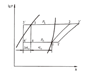 下面來分析制冷量的變化。以工程中應用.多的蒸汽壓縮式制冷循環(huán)為例,如圖1,1-2-3-4-1為飽和循環(huán)過程;實際循環(huán)為回熱循環(huán)1’-2’-3’-4’-1’(為簡便計算,假設蒸發(fā)器和冷凝器中的過程等壓,考慮*定的吸氣過熱度和*熱節(jié)流)。其中1-1’過程過熱,兩狀態(tài)點壓力相同,記為p1=p1’;1’狀態(tài)點溫度t1’為過熱溫度;1’-2’為*熱壓縮過程,等熵壓縮;2’-2-3-3’是制冷劑在冷凝器中等壓冷卻和凝結(jié);3-3’為過冷;3-4和3’-4’分別是*熱節(jié)流過程,記為h3=h4和h3’=h4’。