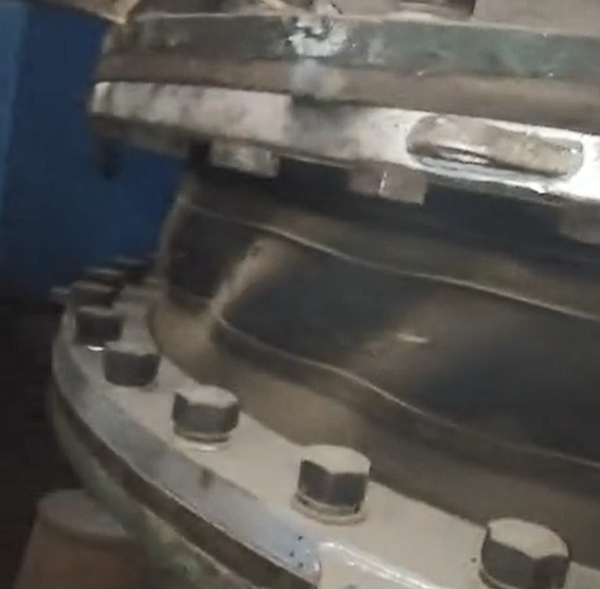 原因分析:產(chǎn)品在使用過程中受到外力導(dǎo)致產(chǎn)品扭轉(zhuǎn),橡膠膨脹節(jié)在使用過程中嚴(yán)禁出現(xiàn)扭轉(zhuǎn)現(xiàn)象,以下附件有我廠做的一個臨時試驗:外力導(dǎo)致橡膠膨脹節(jié)扭轉(zhuǎn)后的現(xiàn)象。