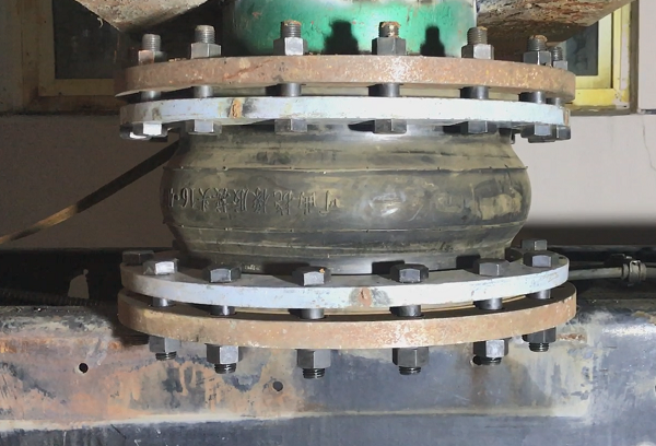 把橡膠接頭的下面固定在固定架子上,橡膠接頭的上端固定一個大鐵板,通過叉車的前進來推動鐵板的移動,在鐵板向前移動的同時,橡膠接頭中間部位出現(xiàn)了扭曲現(xiàn)象,和客戶反饋過來的現(xiàn)象一致,得出的結(jié)論就是客戶現(xiàn)場管道產(chǎn)生扭曲現(xiàn)象導(dǎo)致。