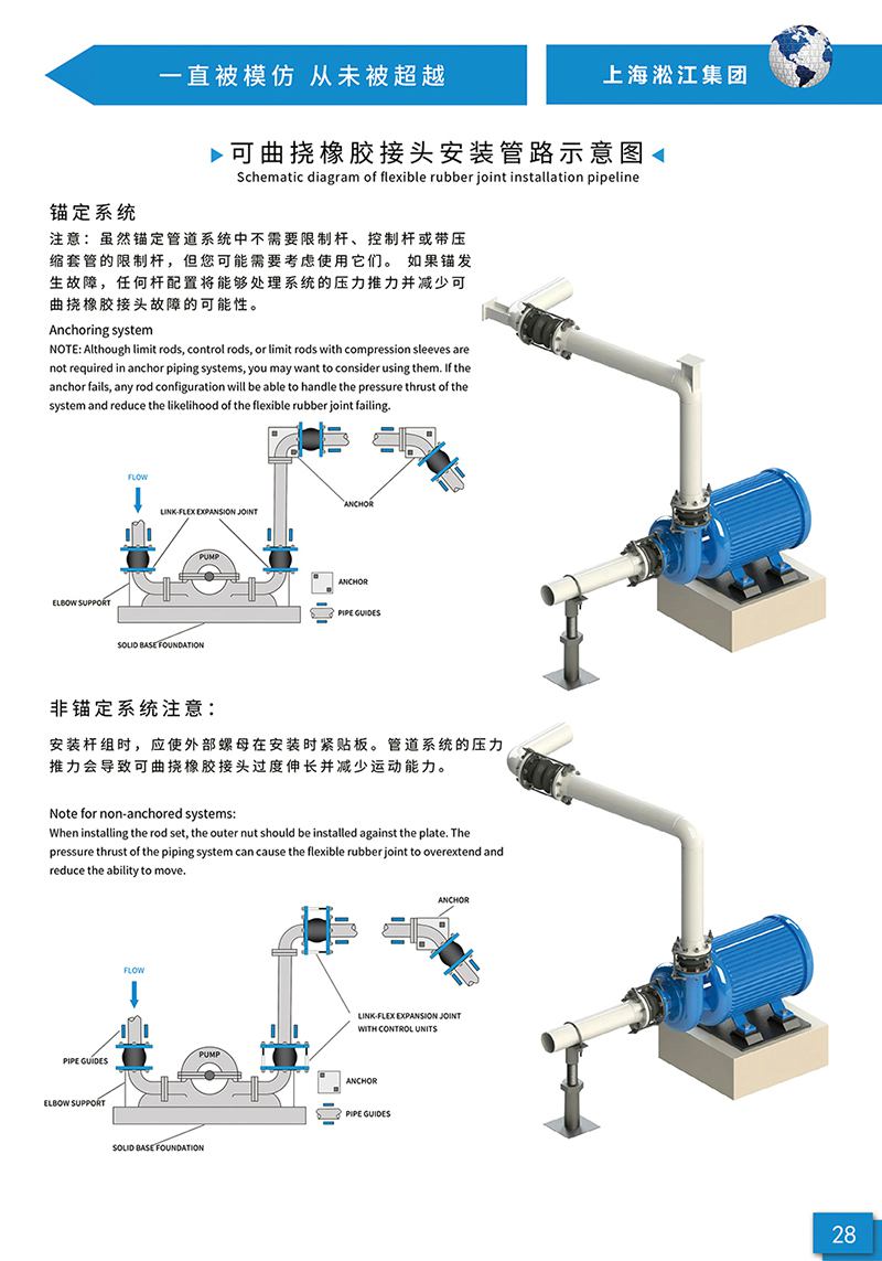7、DN200以上大口徑橡膠膨脹節(jié)在PN10以上壓力使用時建議加裝限位拉桿,避免管道位移量超出橡膠膨脹節(jié)位移量,出現(xiàn)拉脫現(xiàn)象。