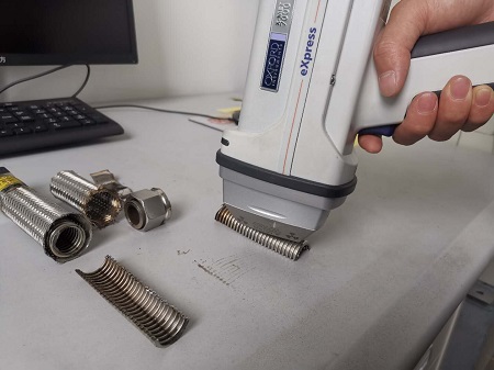 金屬軟連接切開后,先對(duì)材質(zhì)進(jìn)行檢測(cè),我廠通過光譜儀對(duì)波紋材質(zhì)進(jìn)行檢測(cè),確保材質(zhì)達(dá)到8個(gè)鎳以上;